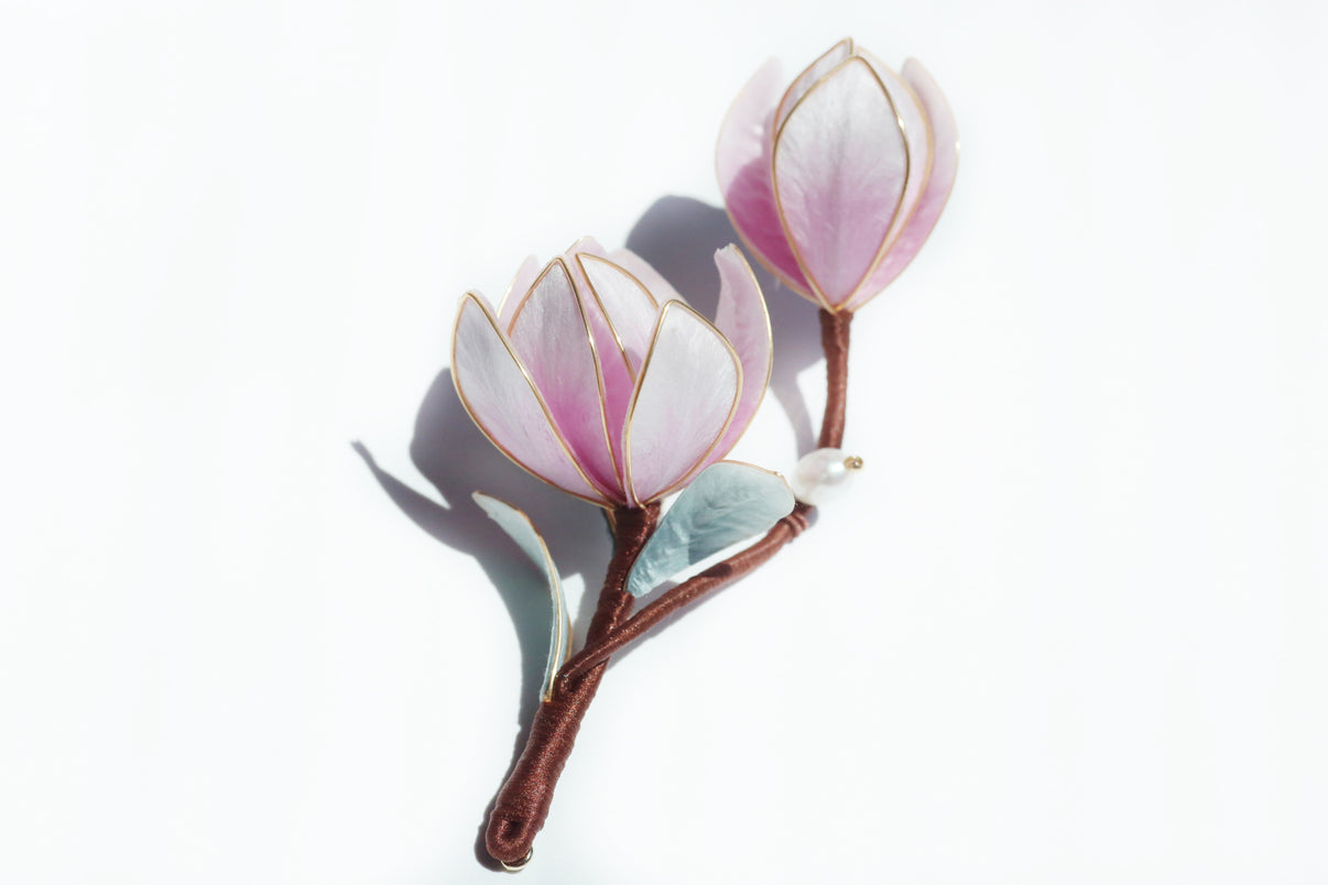 Capture the serene beauty of early spring with this exquisite pink magnolia bud brooch. Symbolizing purity, nobility, and perseverance, the magnolia is a timeless emblem of grace. Meticulously crafted using the ancient Ronghua (velvet flower) technique, this piece captures the delicate, velvety texture of the petals in full, luxurious detail.